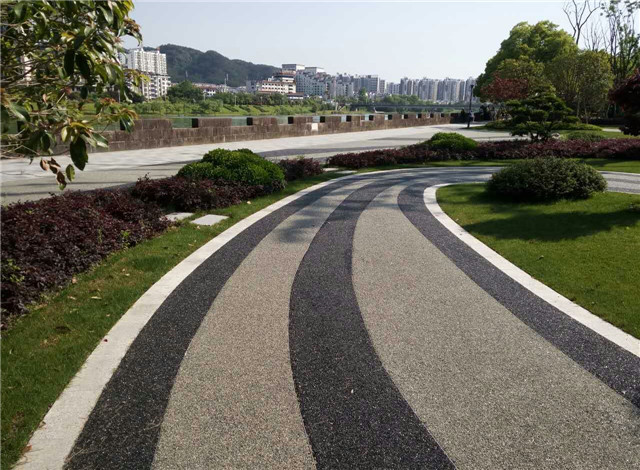 膠粘石透水路面是天然彩色石子與高耐候改性高分子樹(shù)脂經(jīng)特殊工藝制作而成,具有堅(jiān)固美觀、色澤天然炫麗、不易褪色的特點(diǎn),是一種新穎的藝術(shù)景觀鋪裝材料。而且透水彩膠粘石景